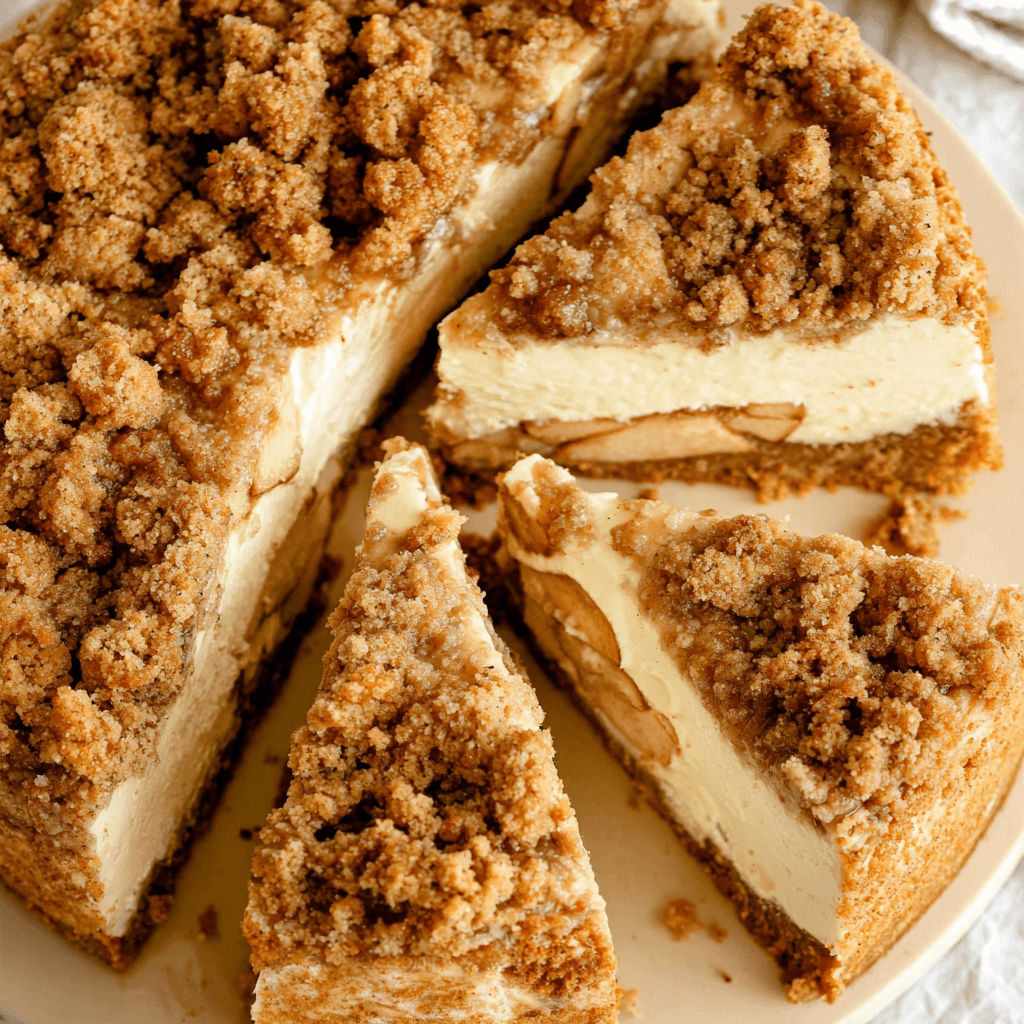 A decadent dessert layering warm spiced apples, creamy cheesecake, and a buttery crumble over a cinnamon-nutmeg cookie crust—perfect for fall celebrations or cozy indulgences.