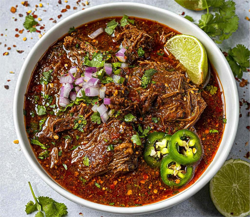 Tender beef or lamb simmered in a smoky chili sauce made with ancho, guajillo, and arbol peppers — a rich, authentic Mexican Birria perfect for tacos or stew!