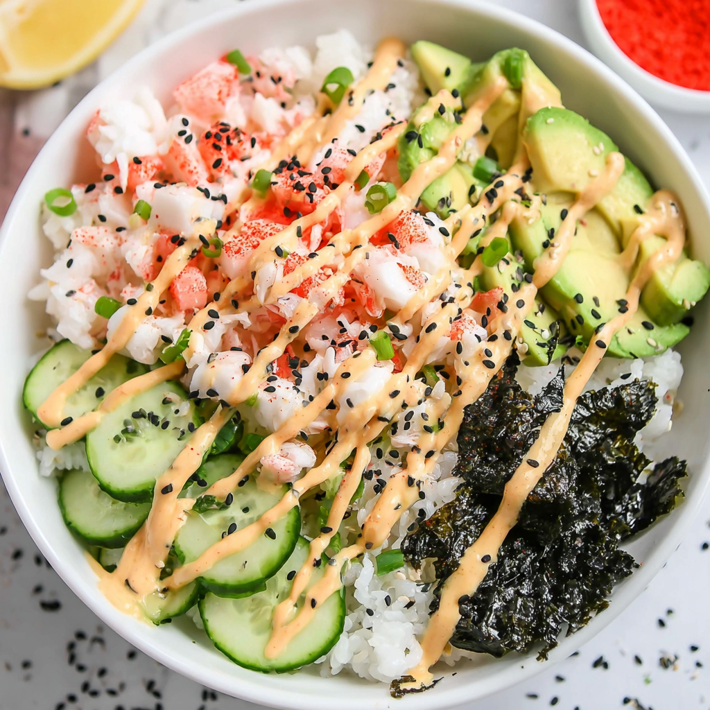 These California Roll Sushi Bowls are a fun, deconstructed version of your favorite sushi roll! Packed with creamy avocado, imitation crab, crisp cucumber, and spicy mayo over tangy sushi rice, …