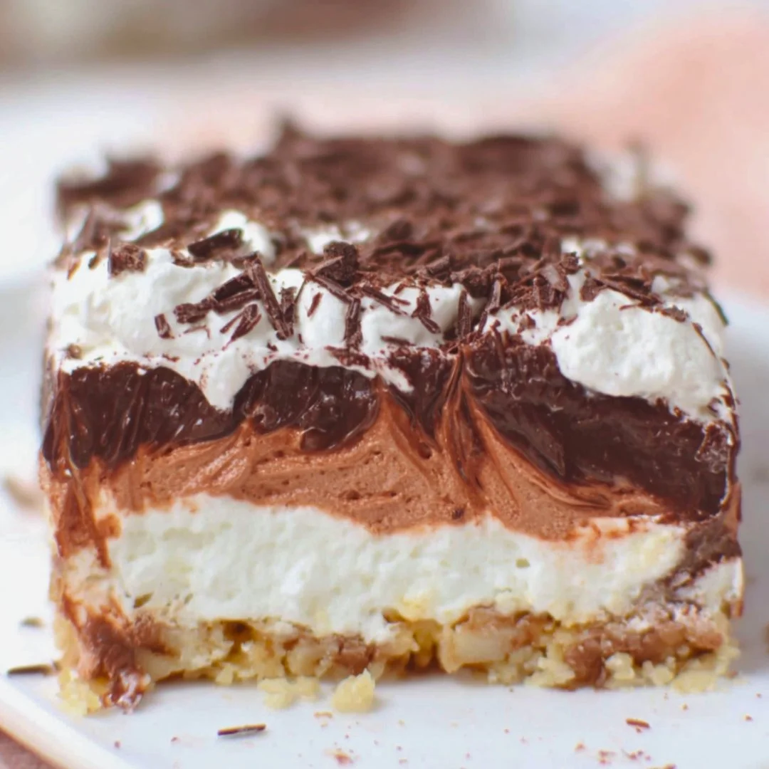 This easy, no-bake Chocolate Delight is a creamy layered dessert that combines a buttery nut crust with chocolate pudding and whipped topping, perfect for any occasion.