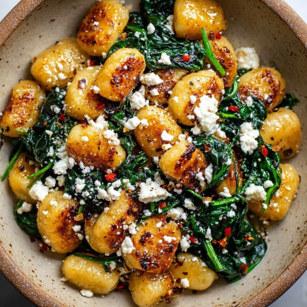 A healthy yet indulgent 25-minute dinner featuring crispy golden gnocchi, garlicky spinach, and creamy feta. Perfect for quick weeknights or cozy weekend meals!