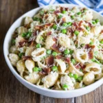 - In a large mixing bowl, combine the cooled pasta, peas, bacon, and parmesan. Pour the dressing over the top and gently stir to coat.
