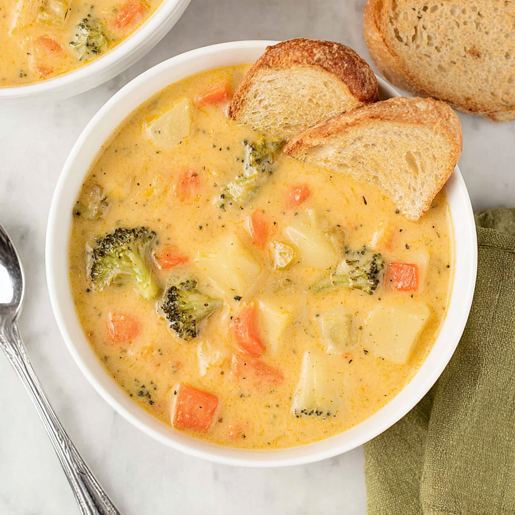 Keywords: creamy vegetable soup, cheesy soup, broccoli cheddar, healthy comfort food, cozy winter dinner