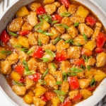 A sweet and savory stir fry that blends tender chicken with vibrant bell peppers and juicy pineapple, enveloped in a luscious sweet and sour sauce.