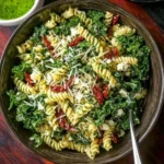 Mix Salad: In a large mixing bowl, drizzle a touch of olive oil over the roughly chopped kale. Gently massage the leaves with your fingers for 1-2 minutes to tenderize them. Add the cooked pasta, sun-dried tomatoes, crumbled feta, and shredded parmesan to the bowl.