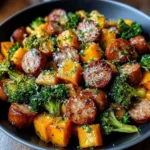 A cozy, one-pan dish featuring tender sausage, caramelized sweet potatoes, and vibrant broccoli, all tossed in a delightful honey garlic sauce.