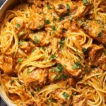 A comforting bowl of creamy pasta with tender shredded chicken, slowly cooked in a flavorful sauce.