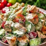 A bright, creamy chicken salad that captures the essence of summer with tender chicken, tzatziki sauce, and fresh cucumbers.